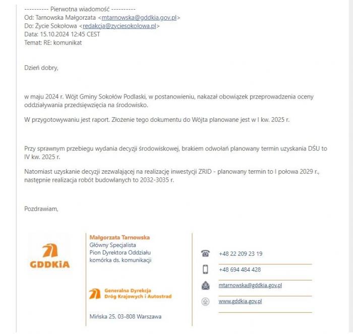 Przekazaliśmy korespondencję w tej sprawie pani burmistrz, m.in. poniższy fragment i cóż – zapewne jak większość sokołowian trzymamy kciuki, by informacje o 7-letnim przesunięciu terminu budowy obwodnicy okazały się jednak jakimś nieporozumieniem w GDDKiA.