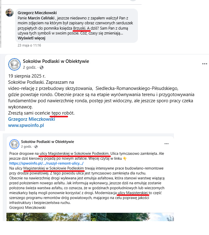 W kampanii wyborczej Grzegorz Mieczkowski zasłynął z pisania o szkole „Trujce”. Głośno było też o jego wersji nazwiska księdza Brzóski - „Brzuska”. Te błędy już mu się rzadko zdarzają. Czyżby zatrudniał korektę? W dzisiejszych czasach to dla Grzegorza Mieczkowskiego zbędne. Bo jest…sztuczna inteligencja! Dzięki temu jako osoba słabo radząca sobie z językiem polskim może z tych rozwiązań skorzystać i zlecić sztucznej inteligencji napisanie artykułu na konkretny temat. Każdy, kto korzysta z tego narzędzia (nawet nastolatek) potrafi rozpoznać taki tekst. Ale ze sztucznej inteligencji też trzeba umieć mądrze korzystać. Samo napisanie polecenia nie wystarcza. Bo sztuczna inteligencja nie jest nieomylna i np. błędnie zapisuje niektóre nazwiska, czy nazwy własne. Od takich przykładów roi się w „artykułach” na nowym portalu. Kilka przykładów na screenach. Sokołowski „redaktor” pisał o „burmistrz Kupnik”, były burmistrz to „Karakila”. Nazwisko wójta gminy Sokołów też oryginalne - Kurek. Z „portalu” dowiemy się też np., że w Sokołowie jest ulica „Magisterska”.