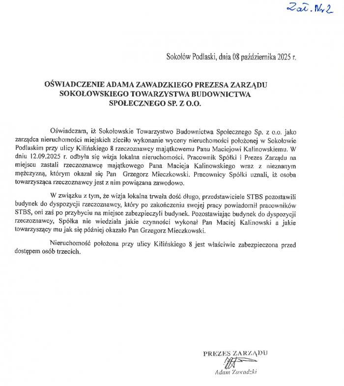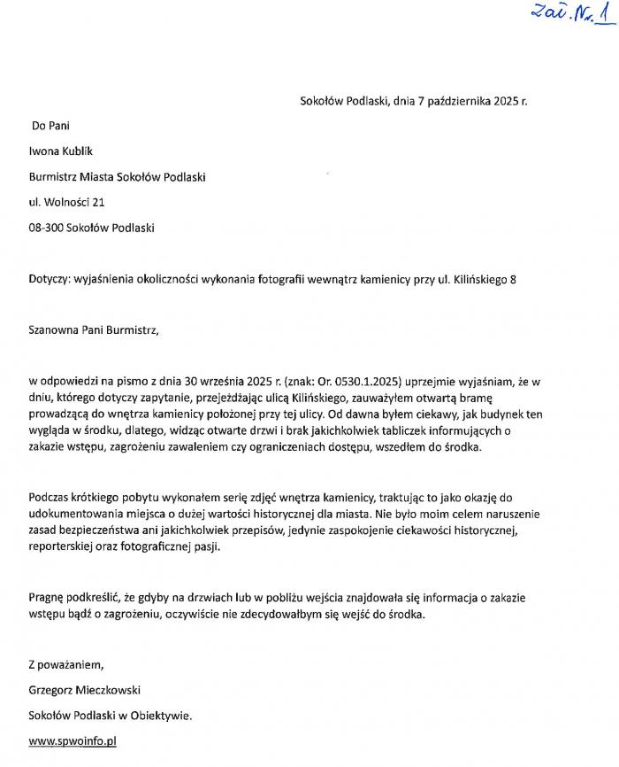 Właścicielem kamienicy jest miasto, więc poprosiłam o wyjaśnienia w tej sprawie burmistrz Iwonę Kublik. Dostałam dwa pisma. W jednym prezes STBS twierdzi, że Grzegorz Mieczkowski wszedł do budynku z rzeczoznawcą majątkowym. A sam Grzegorz Mieczkowski w swoim piśmie napisał, że to miasto zaniedbało obowiązki poinformowania o zagrożeniu i jak stwierdził do kamienicy grożącej zawaleniem mógł wejść każdy. Ot takie dwie, wykluczające się wersje. Ich niedorzeczność potwierdzają zdjęcia Grzegorza Mieczkowskiego na których wyraźnie widać, że wejście od ulicy Kilińskiego jest zamknięte, otwarte zaś są drzwi od podwórza, których z ulicy zauważyć się nie da...