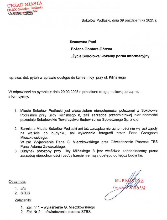 Burmistrz Iwona Kublik w przesłanych nam odpowiedziach na pytania jasno stwierdziła, że nie było zgody władz miasta na wejście przez Grzegorza Mieczkowskiego do budynku przy ul. Kilińskiego.