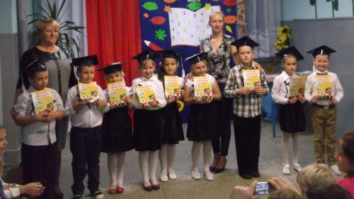 Następnie pani dyrektor dużym ołówkiem dokonała pasowania dzieci na uczniów. Od tej pory pierwszoklasiści mogli poczuć się prawdziwymi uczniami. Na pamiątkę tego wydarzenia każde dziecko odcisnęło swój paluszek w księdze pamiątkowej szkoły, otrzymało dyplom i legitymację szkolną.