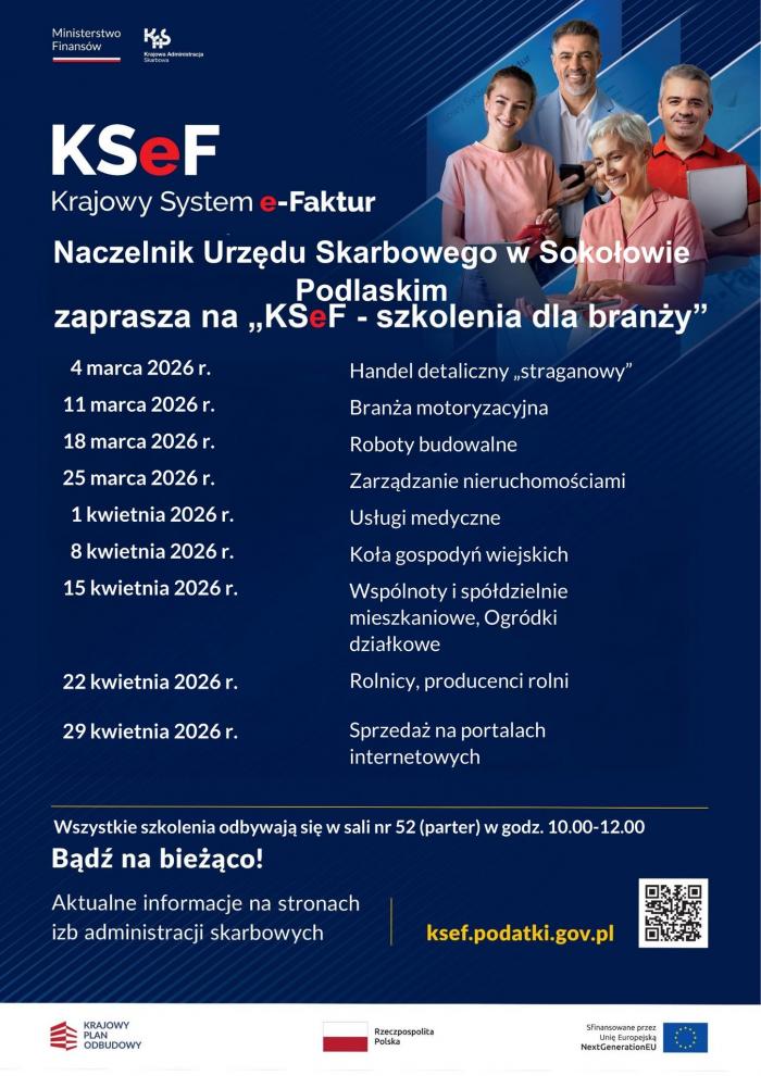 Ministerstwo Finansów, KAS – Krajowa Administracja Skarbowa oraz naczelnik Urzędu Skarbowego w Sokołowie Podlaskim zaprasza na cykl szkoleń „KSeF - szkolenia dla branży”.
