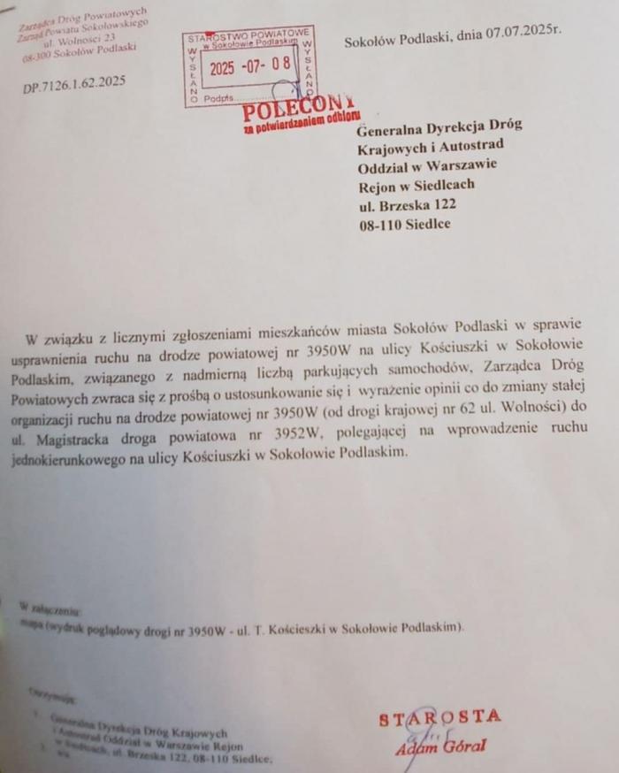 Wicestarosta Zbigniew Czerkas zapytany przez nas o sprawę ulicy Kościuszki podkreśla, że nie ma mowy o lekceważeniu przez powiat sokołowski tematu ruchu na ulicy Kościuszki. Rozmawiano o nim choćby na posiedzeniu wspólnego zespołu drogowego, w którym uczestniczą przedstawiciele miasta, powiatu, dróg wojewódzkich i GDDKiA.