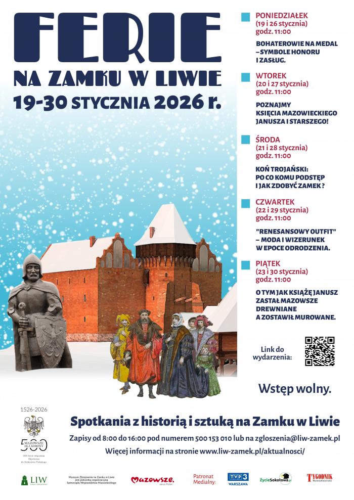 W ferie 2026 w dniach 19-30 stycznia zapraszamy dzieci i młodzież na spotkanie z historią i sztuką na Zamku w Liwie! Zajęcia od poniedziałku do piątku o godzinie 11:00.