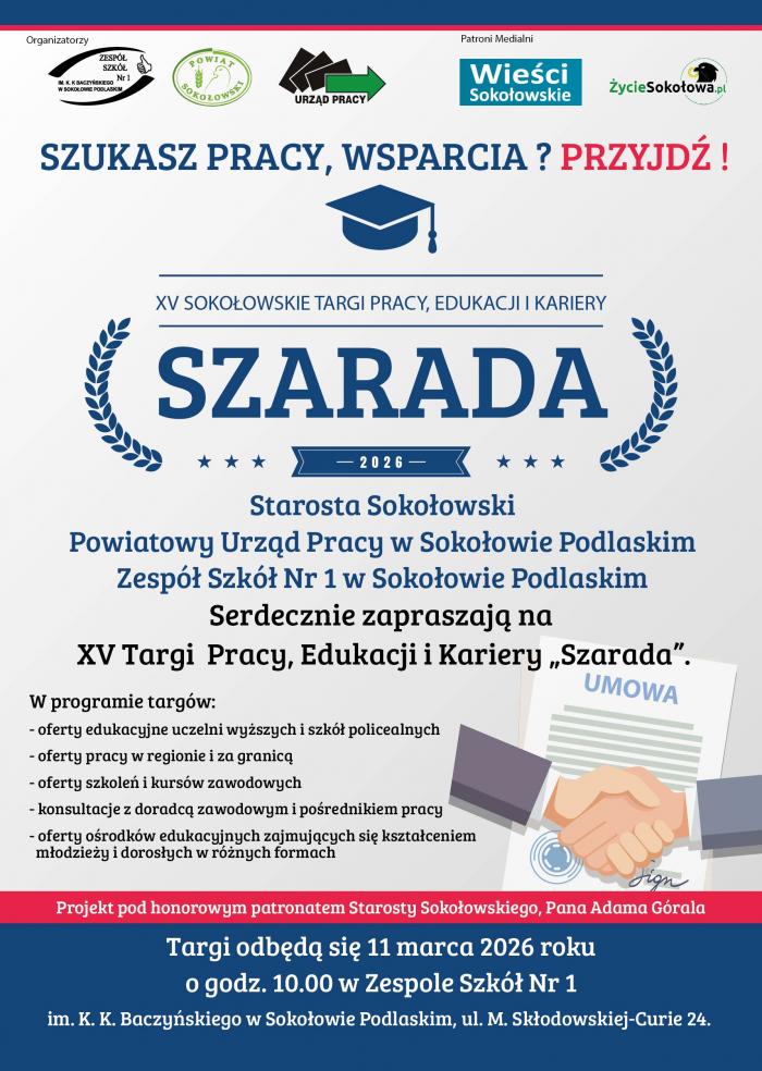 Jak co roku, Targi Pracy, Edukacji i Kariery „Szarada” organizują: Zespół Szkół nr 1, Starostwo Powiatowe oraz Powiatowy Urząd Pracy w Sokołowie Podlaskim.