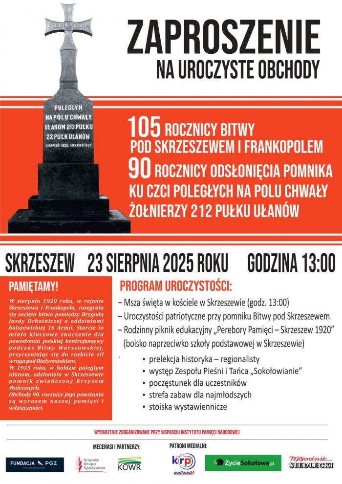 Uroczystości w sobotę, 23 sierpnia, rozpocznie o godzinie 13.00 Msza Św. w kościele pw. św. Stanisława Biskupa i Męczennika w Skrzeszewie. Następnie uczestnicy przemaszerują na plac przy pomniku Bitwy pod Skrzeszewem i Franopolem w asyście: Wojska Polskiego (2. Brygada Pancerna Legionów), Kompanii Reprezentacyjnej Klas Mundurowych Zespołu Szkół Nr 1 im. K.K. Baczyńskiego w Sokołowie Podlaskim, motocyklistów Rajdu Ponary-Katyń i pocztów sztandarowych. W trakcie uroczystości pod pomnikiem zaplanowano m.in. okolicznościowe wystąpienia zastępcy prezesa Instytutu Pamięci Narodowej – dr Mateusza Szpytmy i komandora Rajdu Ponary-Katyń – Michała Szeligi oraz złożenie kwiatów i zapalenie zniczy.