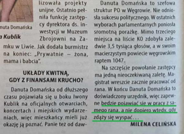 Ciekawe, że podobno przy zwolnieniu Pani Burmistrz podał Pan za powód brak zaufania, a teraz twierdzi, że się spóźniała, nie pojawiała w pracy i wykonywała równolegle inne obowiązki zawodowe. Coś Pan kręci… na dodatek proces wygrała. Plotki głoszą, że to Pan w ostatnim czasie pracy prawie nie pojawiał się w urzędzie, nie wystawiał wniosków urlopowych, więc może warto najpierw spojrzeć na siebie ?
