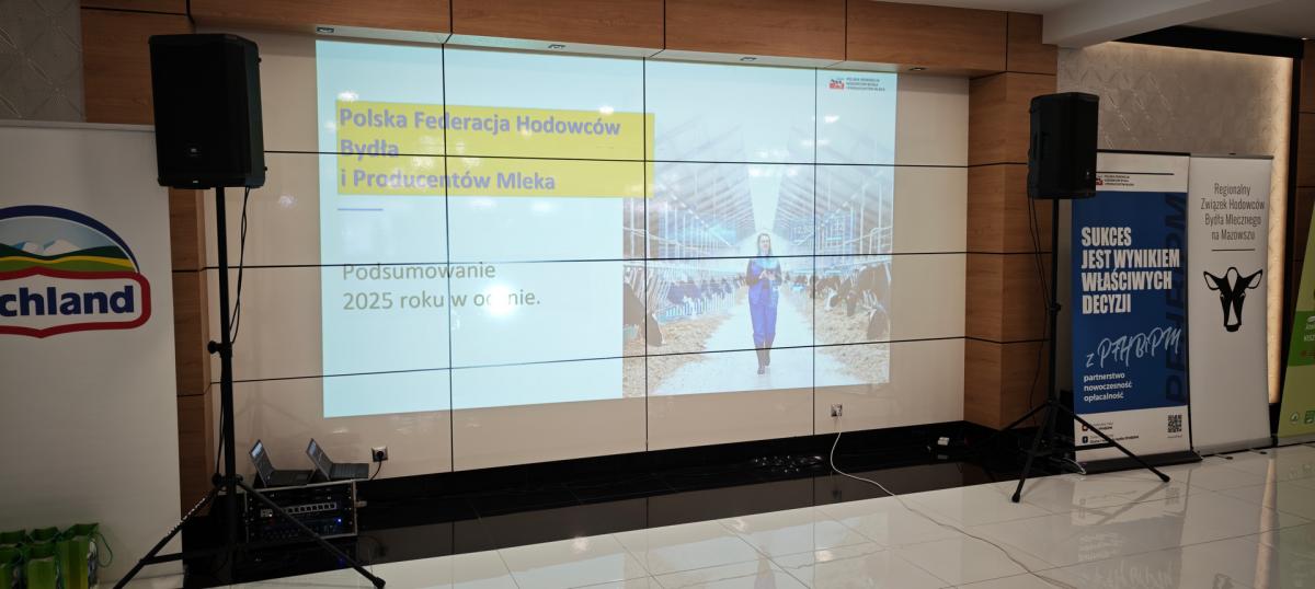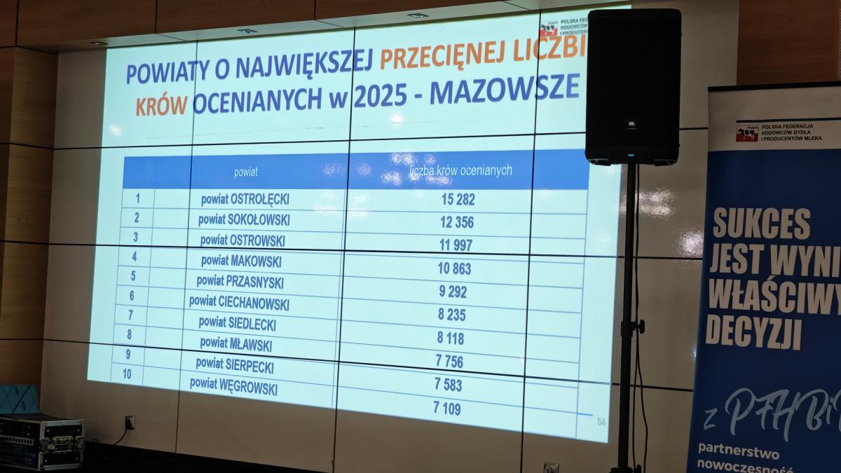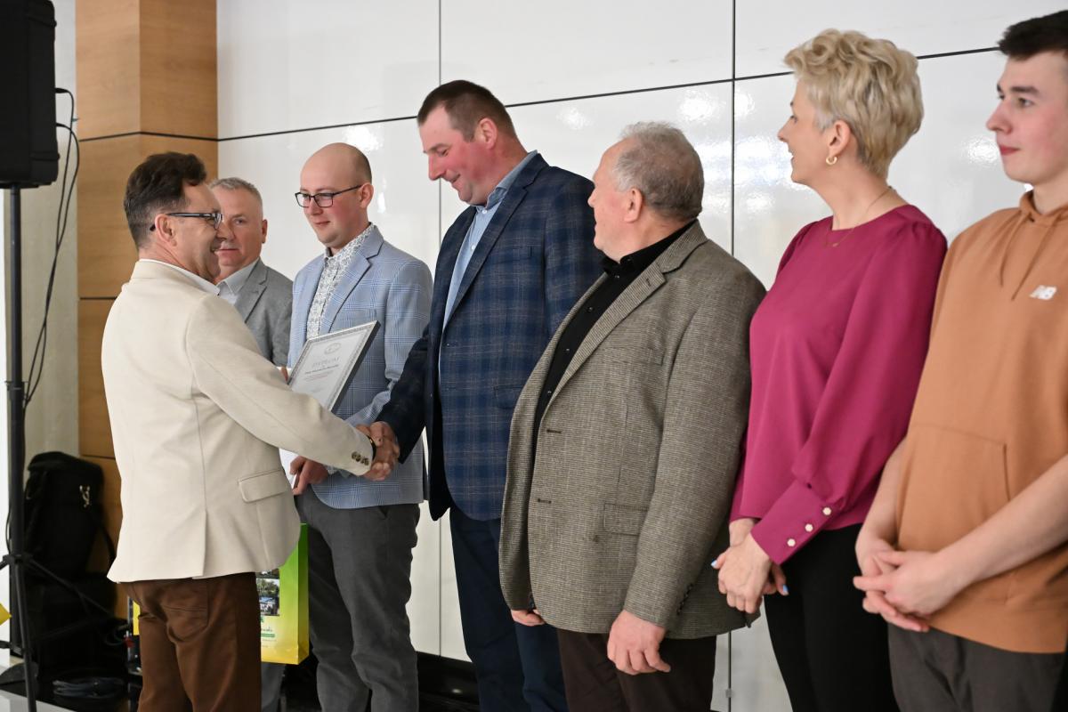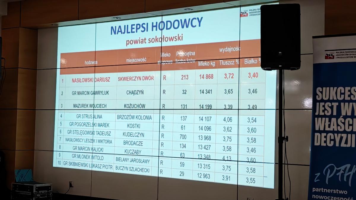 Galeria ze spotkania podsumowującego wyniki hodowców bydła mlecznego w 2025 roku, zorganizowanego przez Regionalny Związek Hodowców Bydła Mlecznego na Mazowszu oraz PFHBiPM Region Oceny Centrum w Parzniewie. Pogratulowano dziesiątce najlepszych z powiatu sokołowskiego, który jest w ścisłej czołówce Mazowsza. Widać m.in. wyróżnionych rolników i gości, w tym starostę Adama Górala.