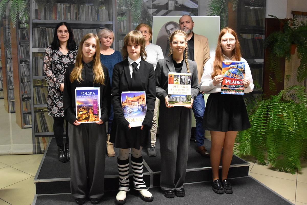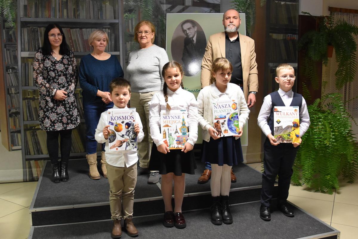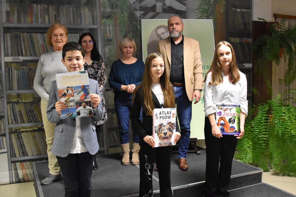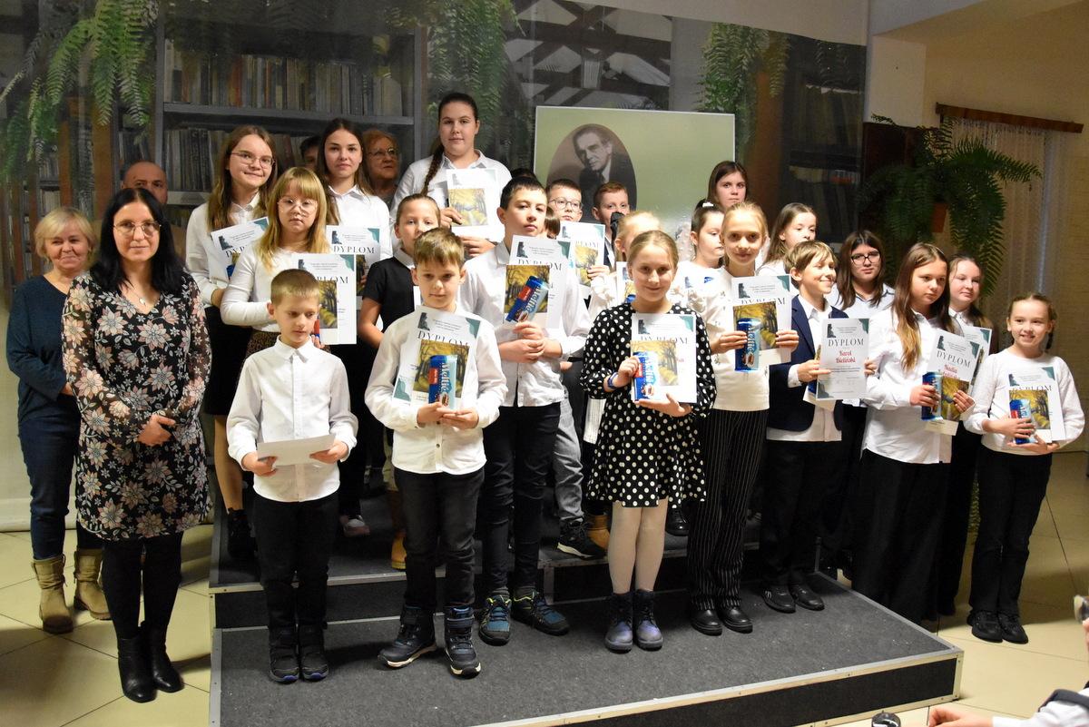 Zdjęcia dokumentujące zwycięzców eliminacji miejskich i gminnych, którzy prezentowali utwór poetycki Konstantego Ildefonsa Gałczyńskiego. Komisja, w składzie Piotr Siemieniuk, Ewa Antolik, Cecylia Mikołajuk, wyłoniła laureatów po przesłuchaniu 38 uczestników podzielonych na trzy grupy wiekowe. Na fotografii widać m.in. zwycięzców z różnych kategorii wiekowych: Hannę Dmowską, Jakuba Kalużnego, Aleksandra Wilka, czy również wyróżnionych uczestników. Całość uchwyciła Anna Filipczuk z MBP.
