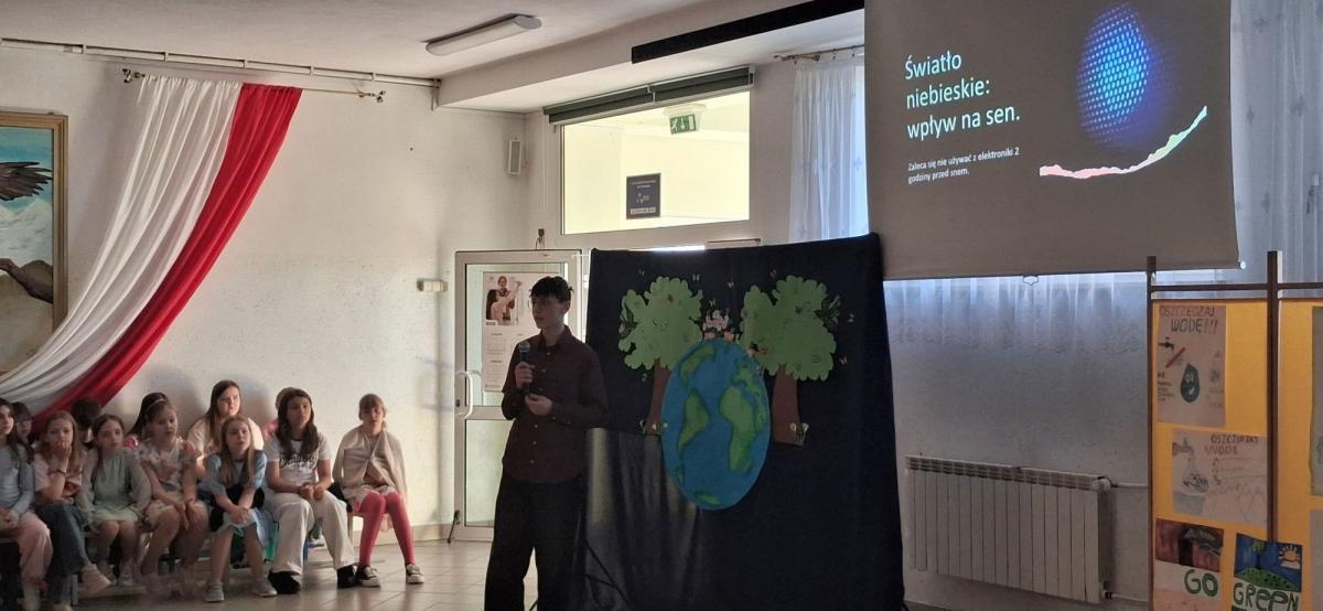 Podczas szkolnej akademii z okazji Dnia Ziemi uczniowie pokazali, jak codzienne wybory wpływają na środowisko. Była prezentacja multimedialna Gabrysi i Mai z klasy szóstej, piosenki klasy czwartej o dobrych nawykach oraz wystąpienie Maćka z ósmej klasy o smartfonach, świetle niebieskim i utylizacji elektroniki. Przypomniano też zasady segregacji i różnice między butelkami kaucyjnymi a tymi do recyklingu.