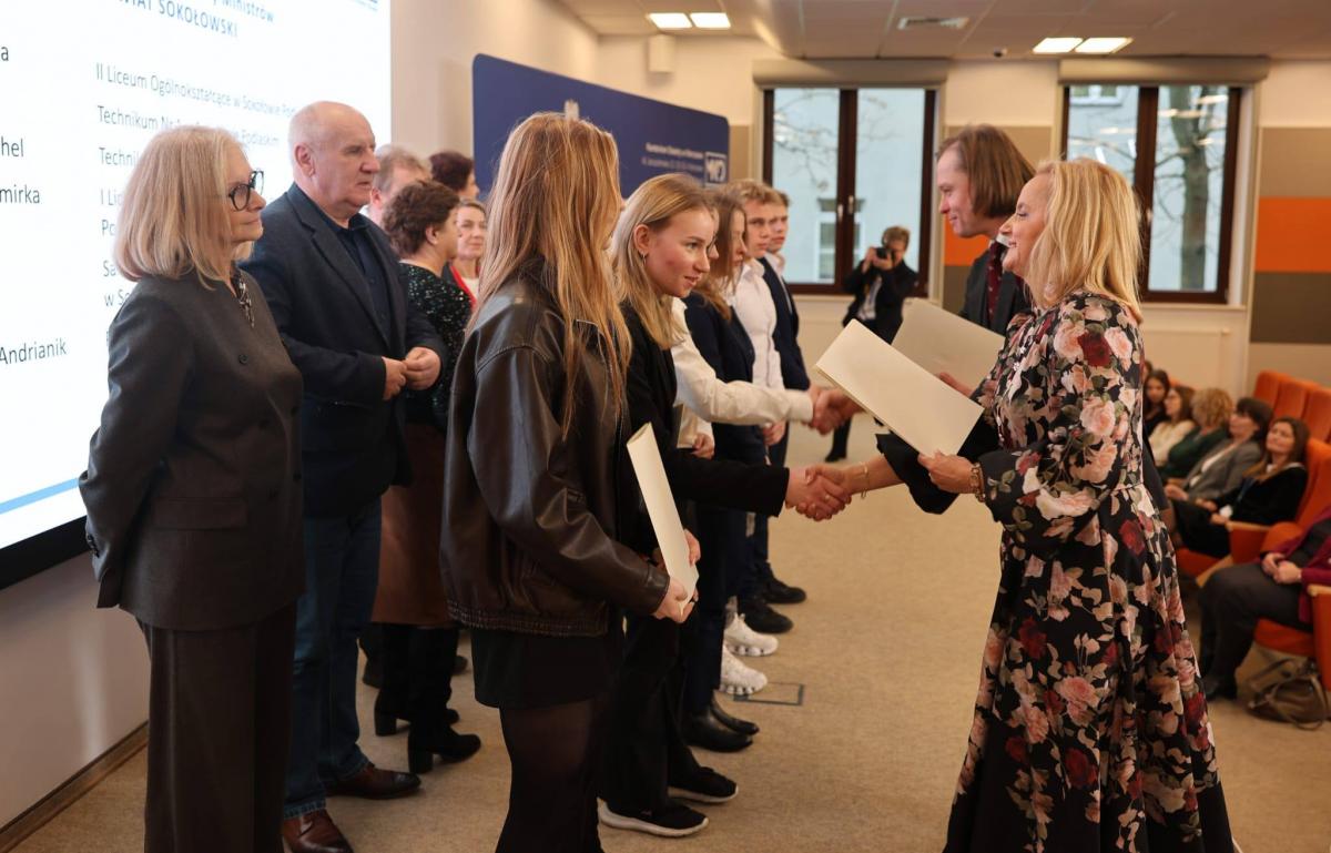 W ubiegłym roku szkolnym sześciu uczniów z powiatu sokołowskiego otrzymało prestiżowe Stypendium Prezesa Rady Ministrów, które wynosi 500 zł miesięcznie. Wśród wyróżnionych znaleźli się m.in. Dawid Rytel-Andrianik z LO w Kosowie Lackim i Katarzyna Niemirka z I LO w Siedlcach. Nagrody odebrali także uczniowie z ZSP w Sokołowie Podlaskim i ZSR w Sokołowie Podlaskim. Wszyscy laureaci spotkali się z wojewodą mazowieckim i kuratorem oświaty, otrzymując gratulacje za swoje osiągnięcia. Galeria zdjęć dokumentuje tę radosną ceremonię.