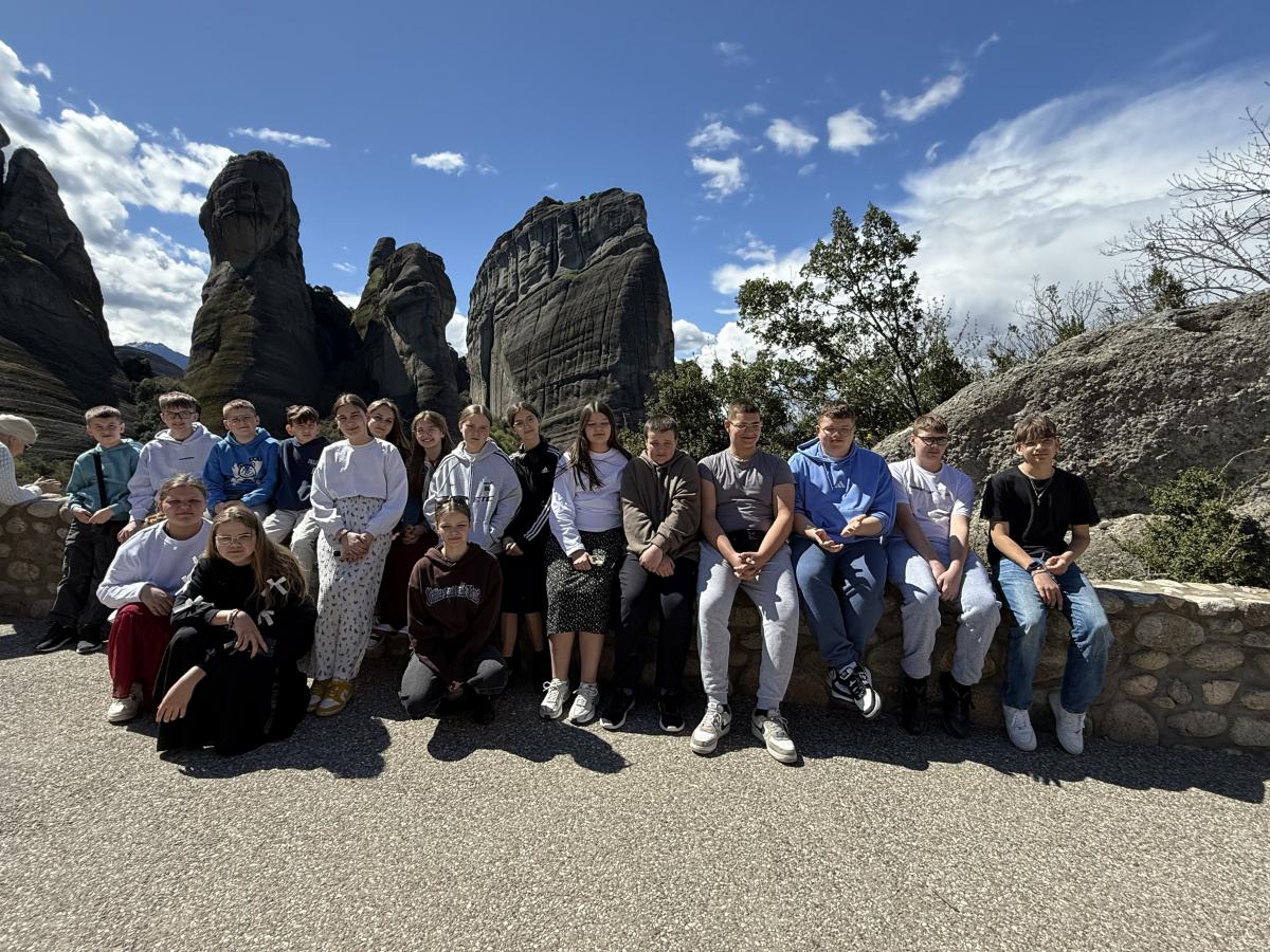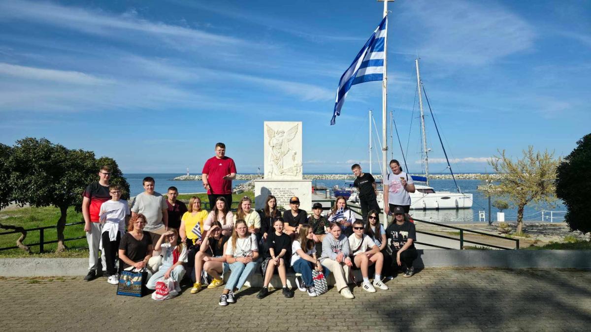 Galeria pokazuje wyjazd uczniów do Grecji w ramach FERS 2021-2027 i programu Erasmus+. Widać zajęcia w szkole partnerskiej, poznawanie języka, tańców i smaków, m.in. fetę i oliwę. Są też kadry ze zwiedzania Riwiery Olimpijskiej, wąwozu Enipeas, Paleos Panteleimonas, Meteorów, Werginy, zamku Platamonas i Salonik oraz chwile relaksu nad Morzem Egejskim.